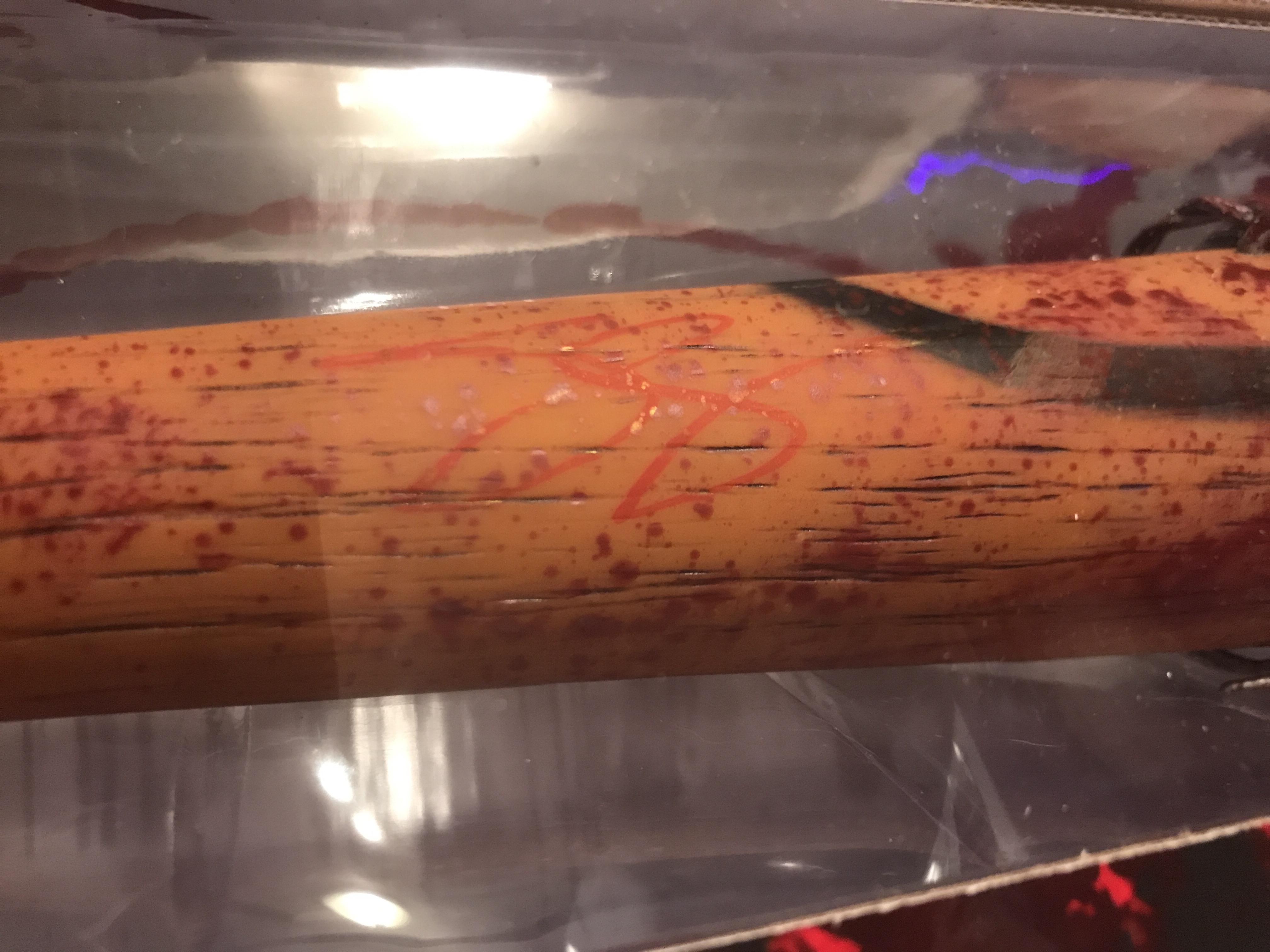 In September of 2017, I met Steven Yeun (Glenn, from the TV show) at Son of Monsterpalooza, and he signed my bloodied up Lucille bat, which now hangs above the machine (some of the other pics in here have my old, crappy, foam bat in them):